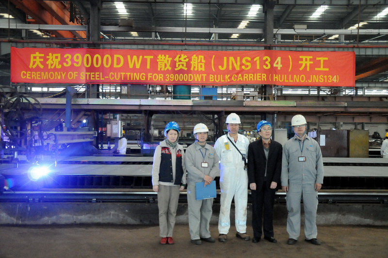 2013年1月4日,我司為DIAMOND SEA SHIPPING LIMITED建造的39000DWT首制船JNS134在南洋廠區(qū)舉行開(kāi)工儀式。 上午11時(shí)左右,DS船東代表與我司代表在總經(jīng)理會(huì)議室共同簽署了開(kāi)工文件,隨后DS船東代表、LR船檢、我司代表前往船體車(chē)間為JNS134船舉行開(kāi)工儀式。船檢對(duì)鋼板進(jìn)行了嚴(yán)密的檢查后,DS船東按下了鋼板切割電鈕,標(biāo)志著JNS134正式開(kāi)工。