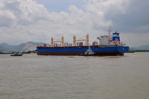 2014年8月18日正午,公司一號碼頭上,樂曲聲在碼頭四周飄揚,一點整,伴隨著一聲長長的鳴笛,鞭炮聲四起,JNS135船在現(xiàn)場工作人員的注視下起錨離港,正式開始自己的海上生涯。