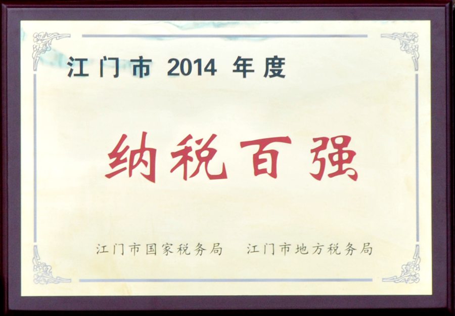 2015年5月8日,我司收到了江門市國稅局、江門市地稅局聯(lián)合頒發(fā)的“2014年度江門市納稅百強(qiáng)”獎(jiǎng)牌。